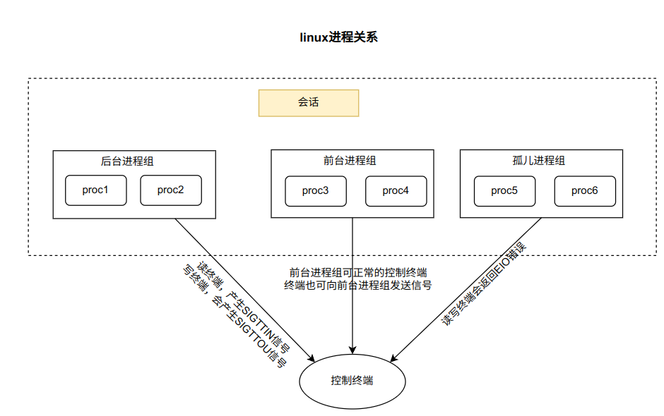 (4)一个会话如果有控制终端,那么它是一个前台进程组,其他的为后台进程组